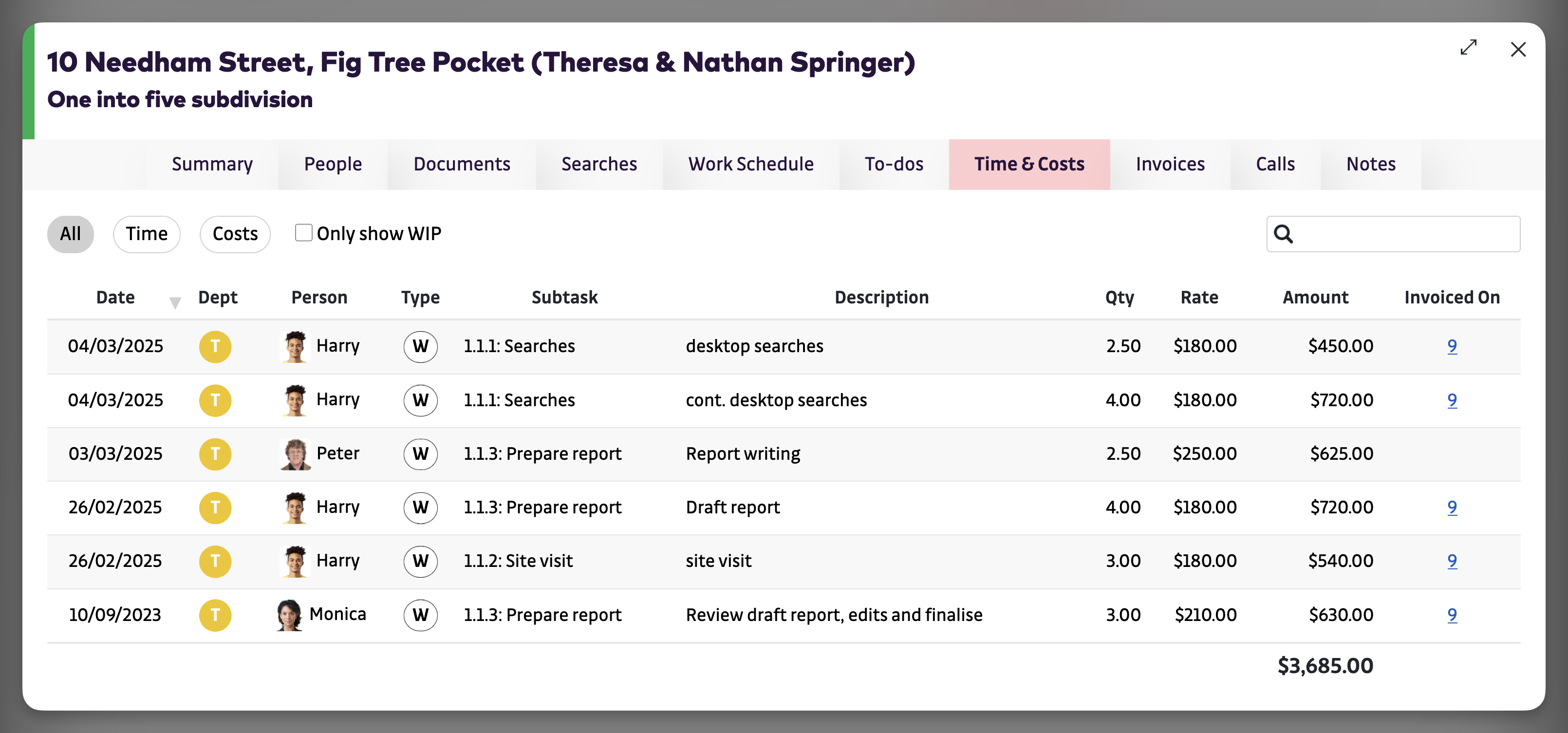 On the Time & Costs tab of the Project View popup, individual timesheets show their allocation status. If the "Invoiced On" field is blank, the timesheet is still WIP.