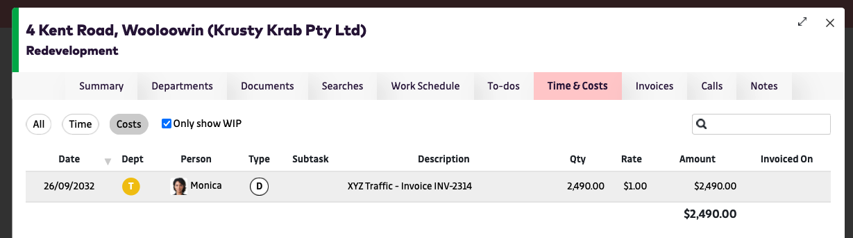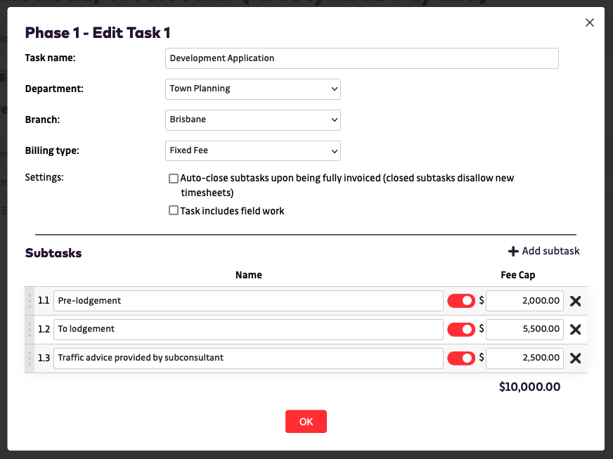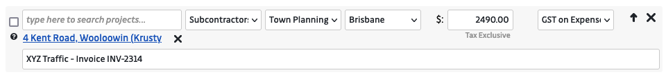 For example, if your client is being charged for a "Town Planning Development Application", which incorporates traffic advice provided by a third-party consultant, you can consolidate the disbursement (e.g., consultant fees) into the subtask for the application. The client will only see one total amount for the application, with the third-party costs incorporated discreetly into the overall figure.