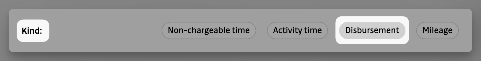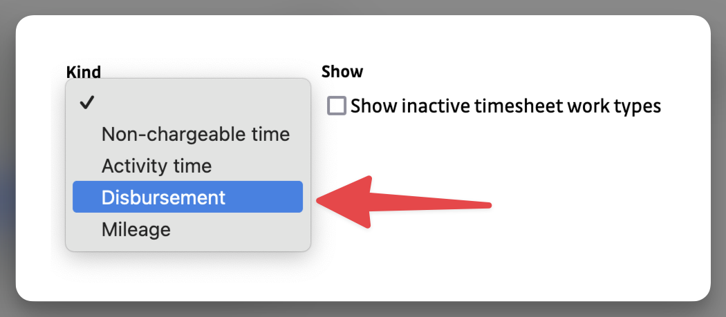 Disbursements belong to this second group. They are a kind of timesheet entry that represents a cost, not time. To make them available, you create a work type in Settings and set its Kind to Disbursement. After that, staff can pick it whenever they need to record a cost directly.