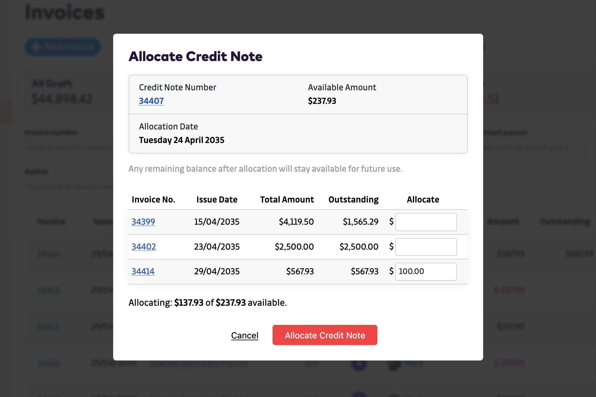 The Allocate Credit Note tool allows you to apply a credit note — in full or partially — to any outstanding invoices of your choosing.