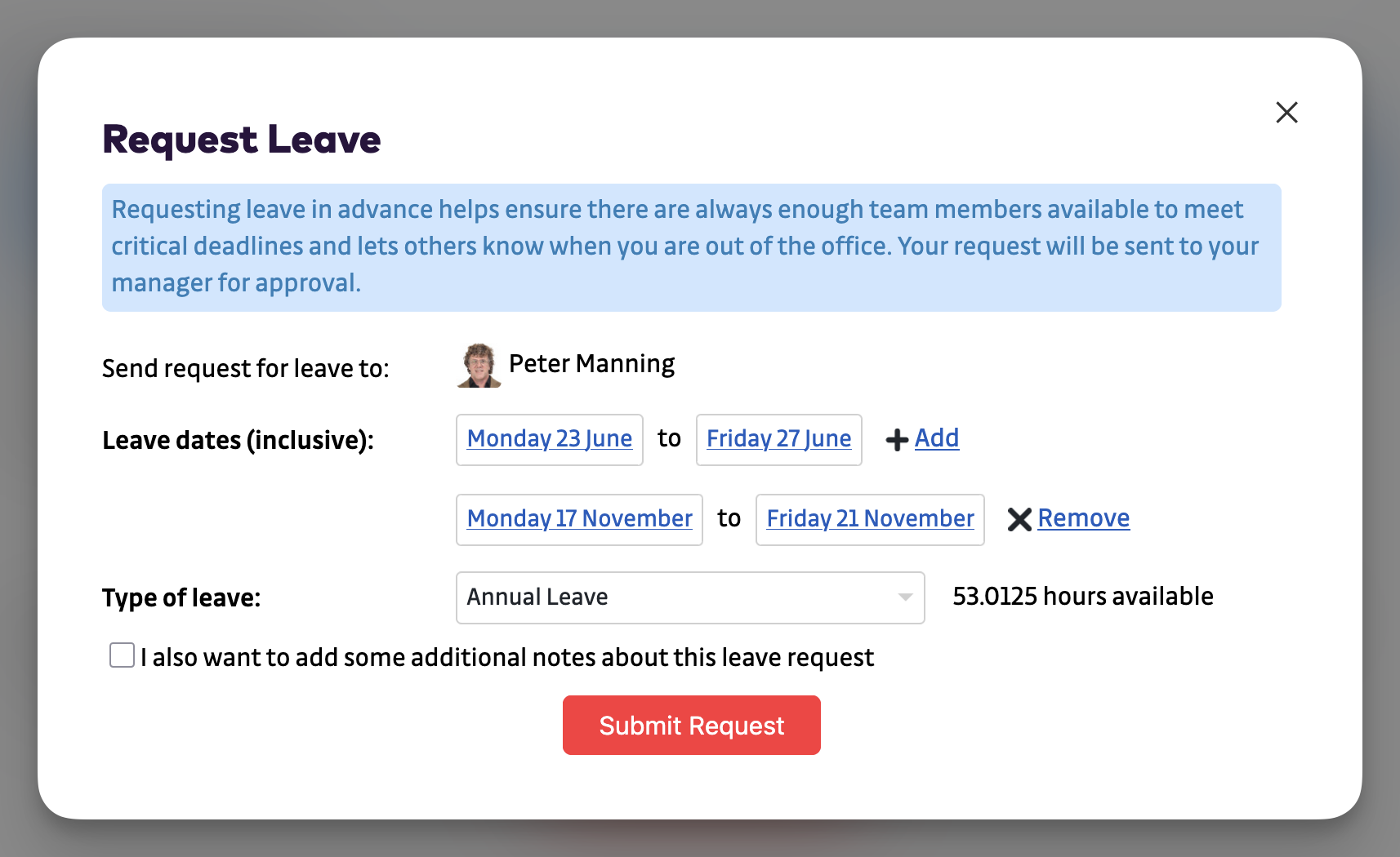 To request multiple blocks of leave (e.g. two non-consecutive periods), click + Add. At least one leave block must be included. -