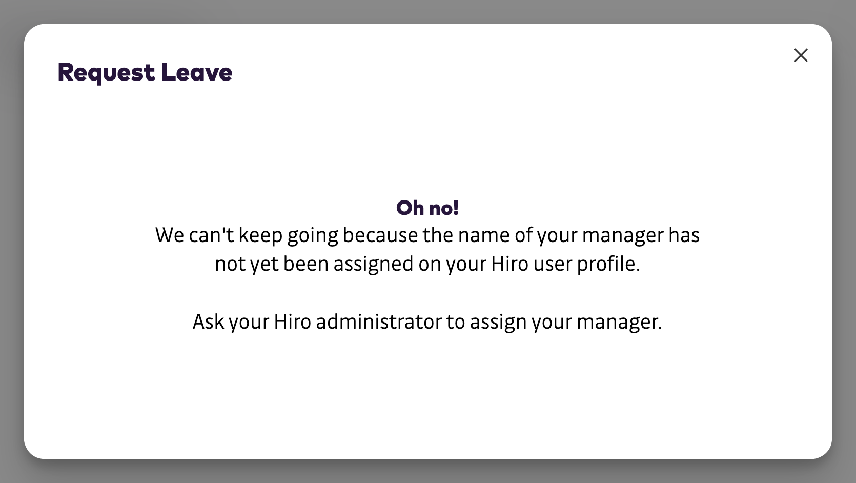 If a manager hasn’t been set, the leave request form will not open. Instead, you’ll see a message explaining that a manager needs to be assigned before you can continue. In this case, contact your Hiro administrator and ask them to update your profile.