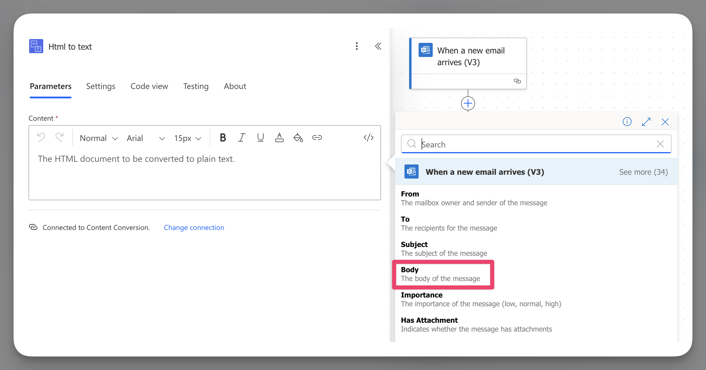 - Add action → search for Html to text and select it.