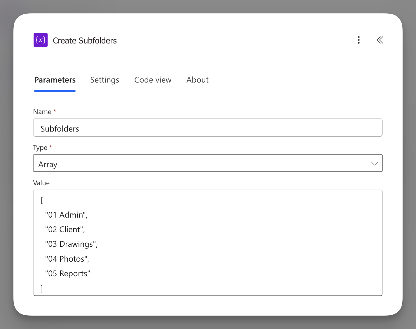 ["01 Admin","02 Client","03 Drawings","04 Photos","05 Reports"] - Add Apply to each over that variable.