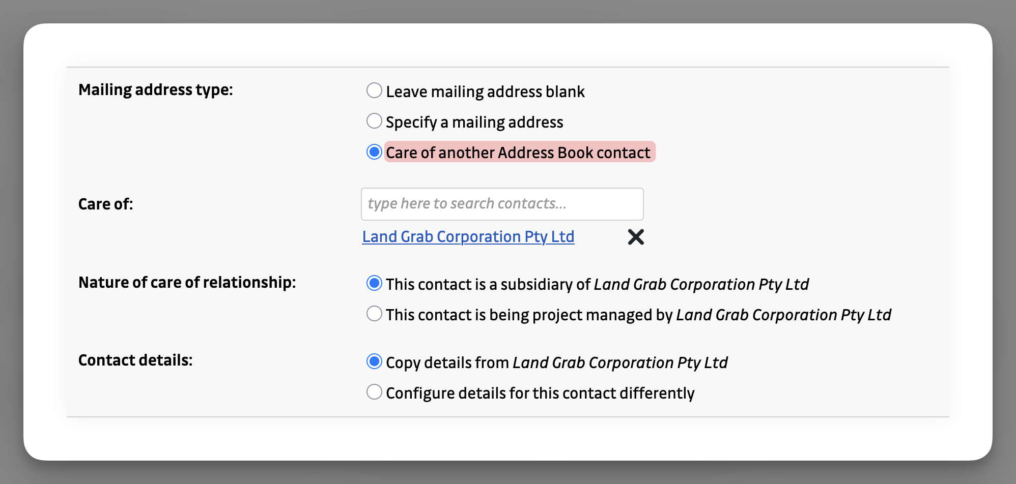 In the Location section, change the Mailing address type to Care of another Address Book contact.