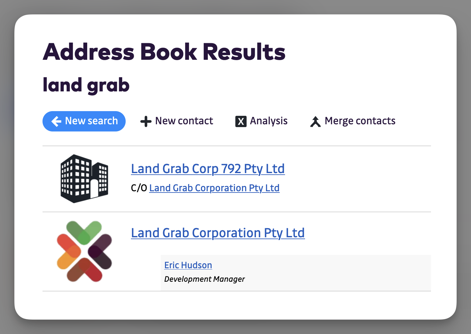 Once a contact has been marked as Care Of another contact, the relationship will appear in Address Book search results. This helps you clearly see which billing entities sit under each client.