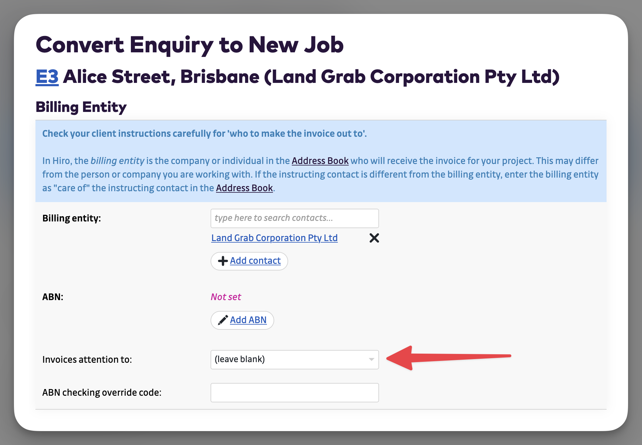 For example, if every selected line on the invoice is from the same department, Hiro will automatically use the default attention contact configured for that department on the job. You can still change it if needed, but you won’t be blocked from saving.