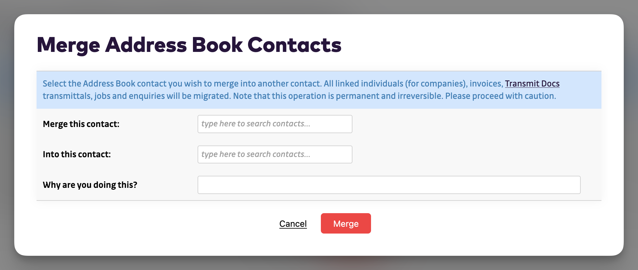 Merging contacts is a one-time, irreversible action.