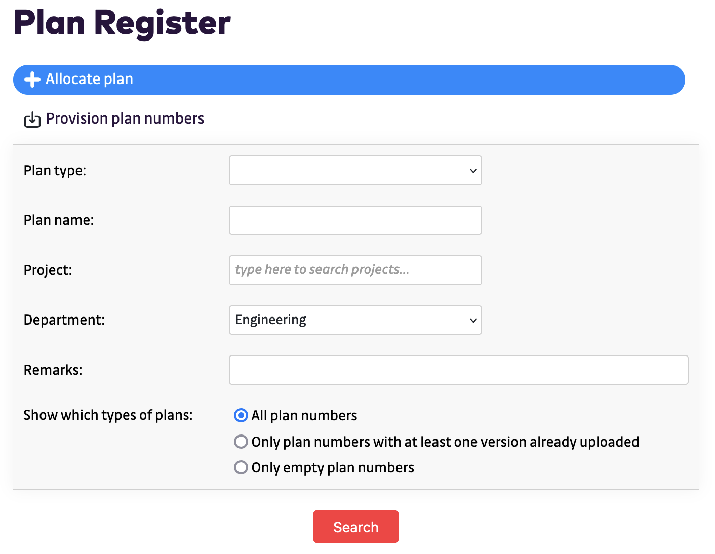 When first navigating to the Plan Register, you will be greeted with a search page enabling you to find plans that are already stored. At the top of the page will be options for provisioning new plan numbers and allocating plan numbers onto a project (learn more here).
