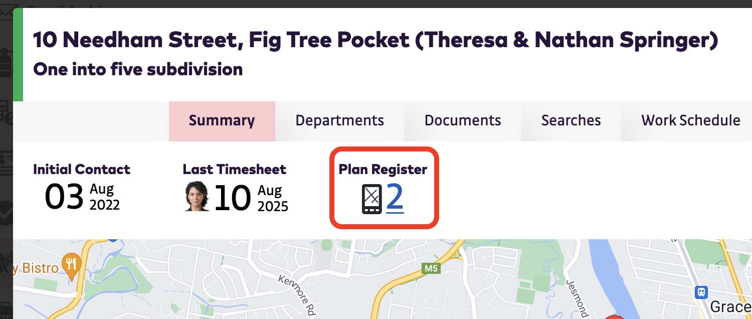 When viewing a project's details via the View Project popup (e.g., after you have searched for and selected a project via the Hiro search icon), an icon will be displayed on the Summary tab showing the number of plans attached to that project.
