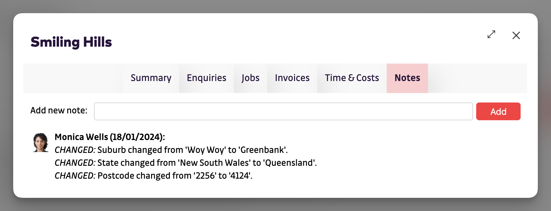 Any changes made to estates are automatically recorded, and can be viewed on the Notes tab when viewing an Estate.