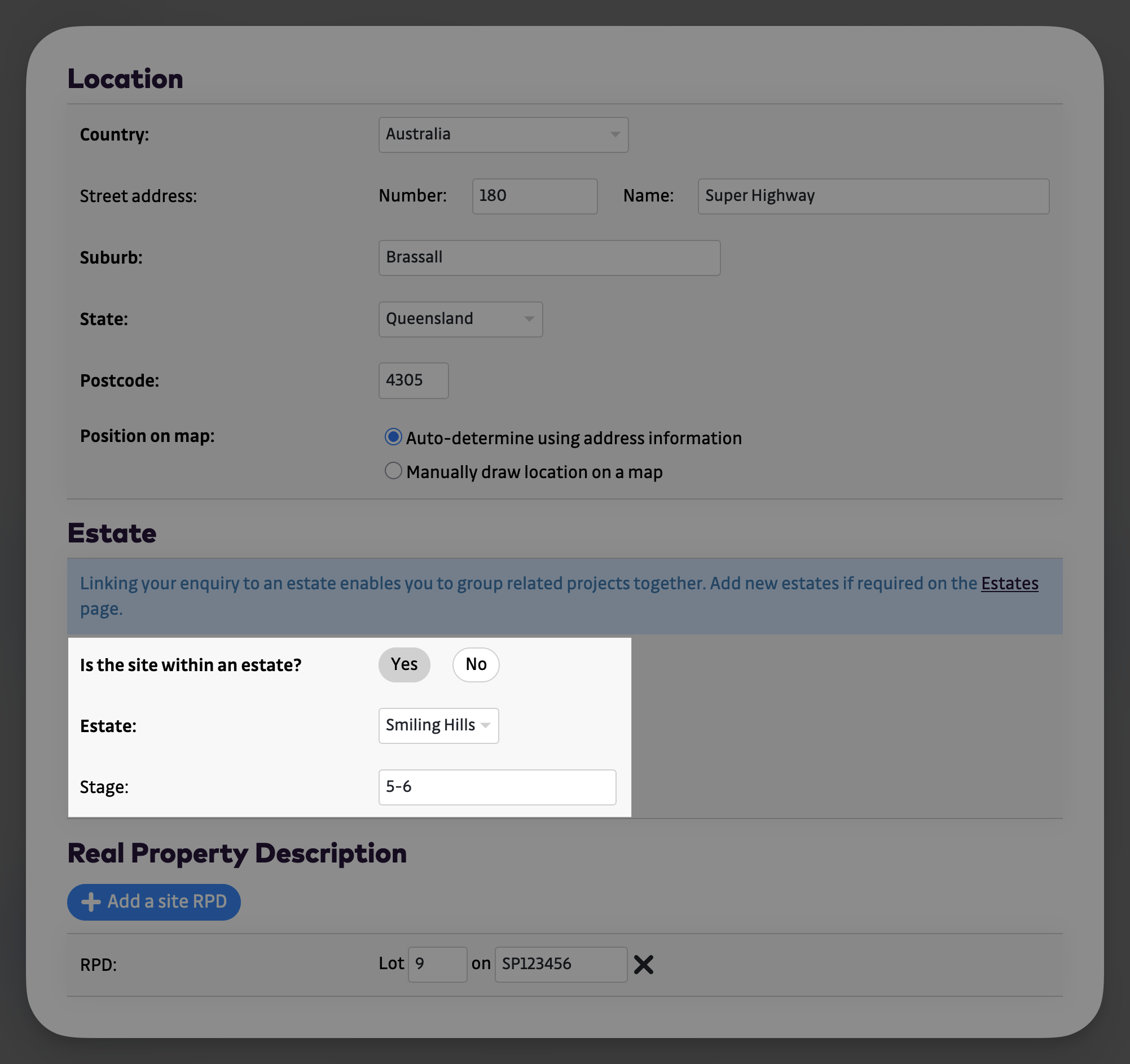 When lodging a new project, enter the Estate details in the Location section.