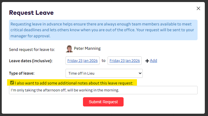 If an employee only wishes to take a part-day, they can enter notes to inform their manager their intention to only take a part day, like below: