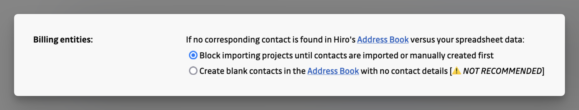 By default, you will be blocked from importing invoices where the name of the billing entity in your spreadsheet is not found in the Address Book. You can disable this block by setting the "Billing entities" option to "Create blank contacts".